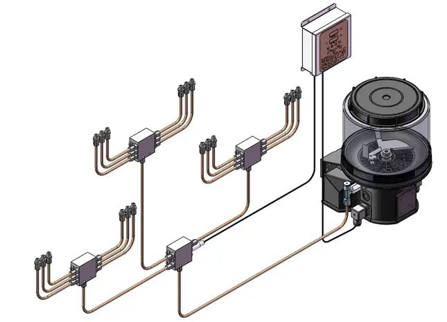 Kanggo ngatasi masalah kasebut, luwih akeh perusahaan nggunakake sistem lubrication otomatis. Sistem kasebut ngontrol jumlah lan frekuensi pelumas kanggo mesthekake peralatan mesthi ing kahanan operasi sing paling optimal.take dhewe - ngasilake sistem pelumas otomatis otomatis minangka conto: